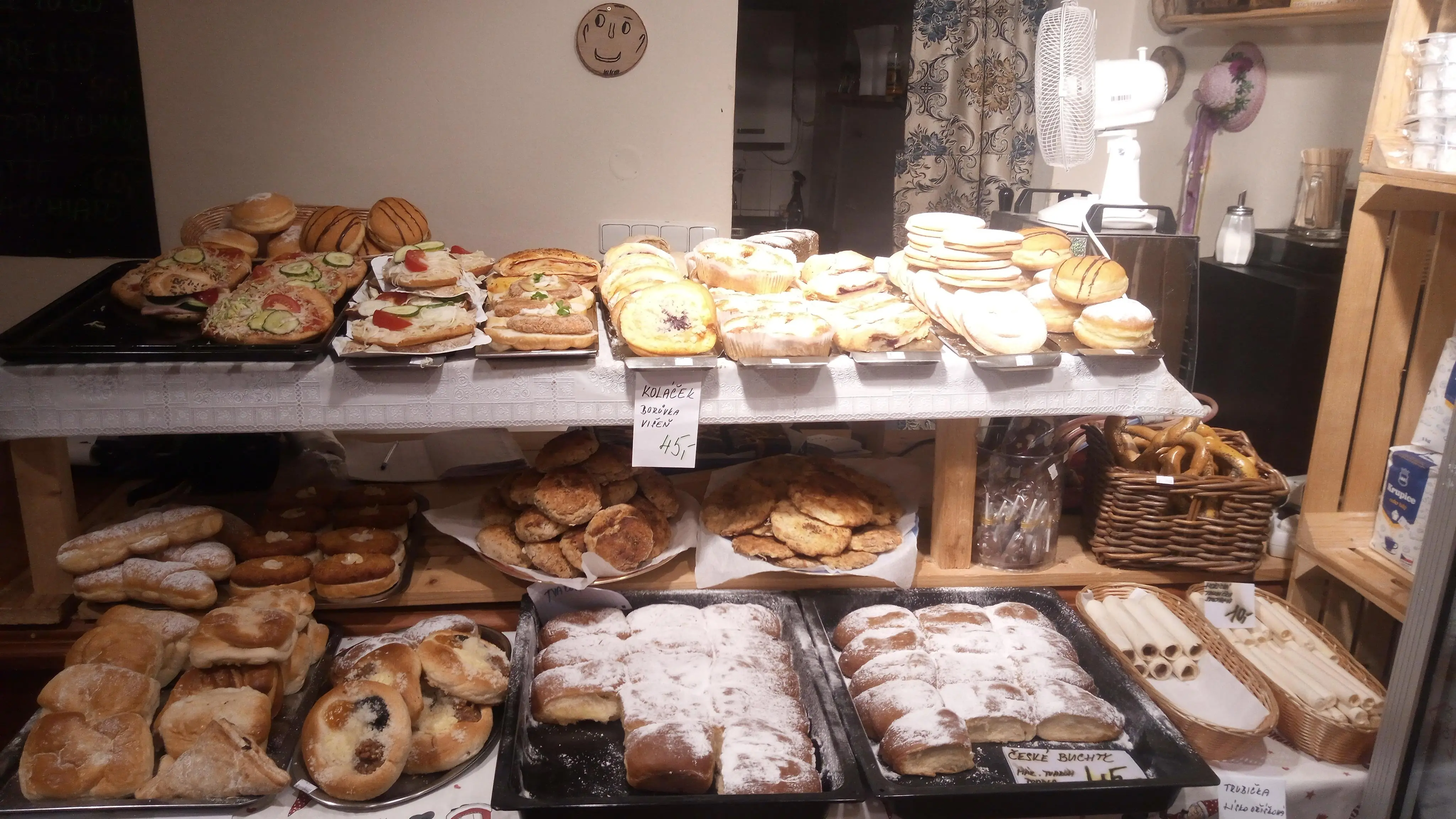 Pekařství nabízí denně čerstvé pečivo z vlastní výroby, chlebíčky, kanapky i koláče. Každý pátek doplňujeme sortiment o soběslavský chléb od Peta Soběslav a produkty od Cais Vlachovo Březí. Zakoupíte u nás také domácí uzeniny, mléčné výrobky z farmy Diviš a další regionální potraviny.
